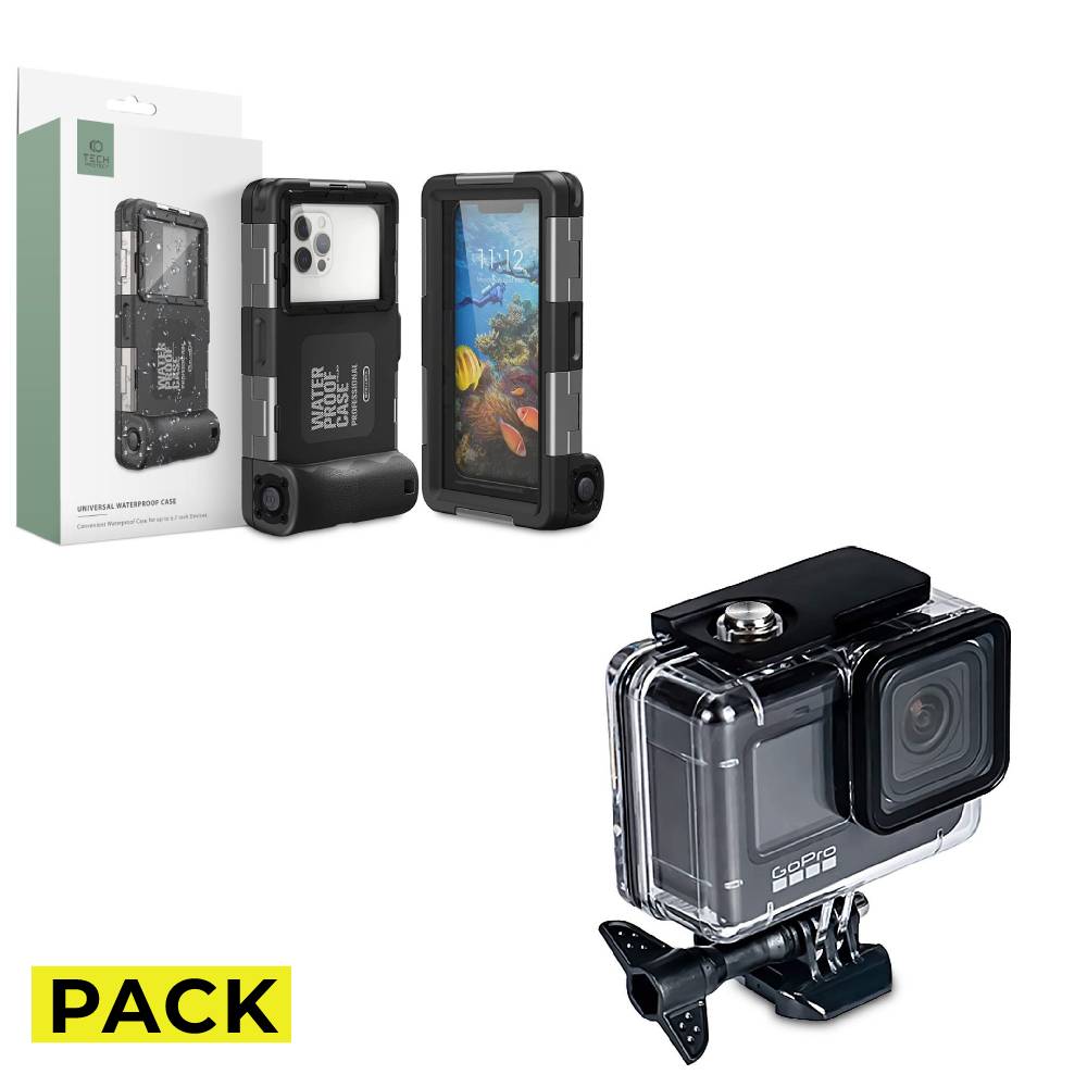 PACK HUSA WATERPROOF TECH-PROTECT IPX8 UNIVERSAL DIVING WATERPROOF CASE BLACK + WATERPROOF HUSA TECH-PROTECT WATERPROOFCASE GOPRO HERO 9 / 10 / 11 CLEAR