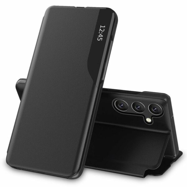 Husa Smart View de la Tech-Protect este realizată din piele sintetică de înaltă calitate, care îmbracă o carcasă dură din policarbonat. Carcasa durabilă și confortabilă are decupaj frontal pentru difuzor, astfel încât poți vorbi la telefon cu husa închisă. Clapeta are magnet integrat și o fereastră prin care, după instalarea aplicației, se afișează ora. Husa este perfect adaptată și nu limitează încărcarea wireless.